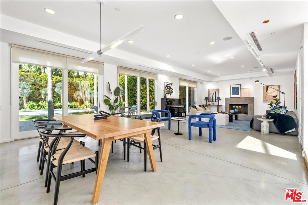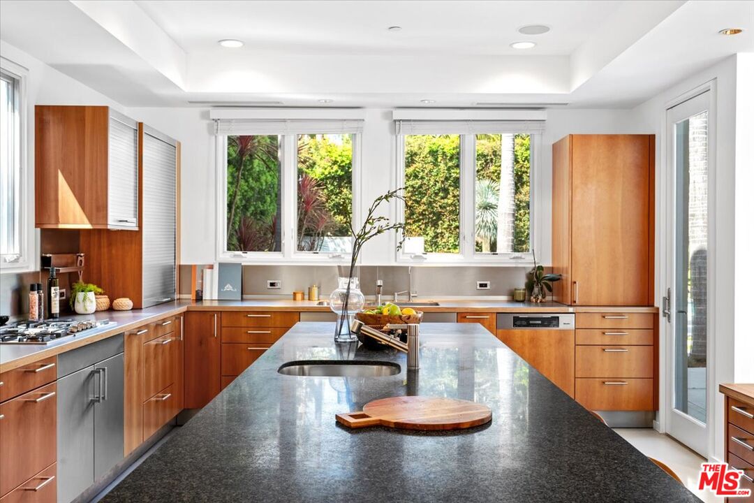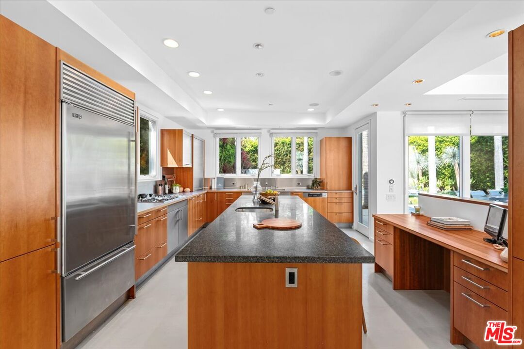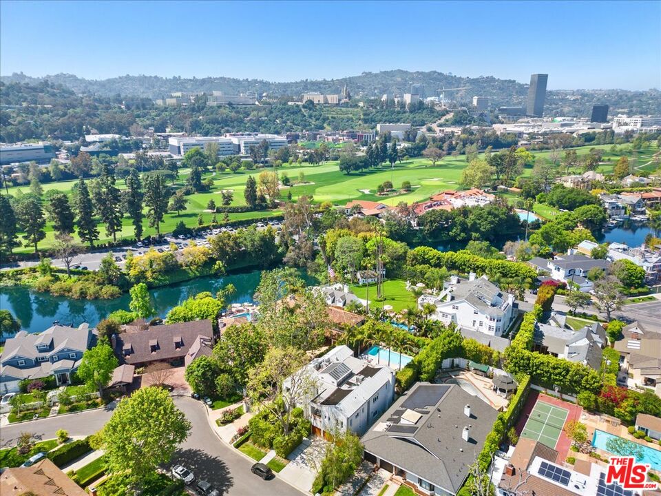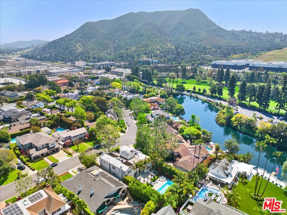 Tucked into one of the most sought-after streets in the Toluca Lake/Burbank pocket, this architectural home sits within a tightly held enclave of just 23 residences, a location that rarely comes available and is well known locally for its privacy and feel. The home pairs clean, modern design with warmth and livability, using materials like glazed concrete, birch, and cherry wood to create a refined, grounded aesthetic throughout. A two-story atrium and expansive skylights bring in natural light, enhancing the open main level that connects the living, dining, and kitchen spaces. The kitchen features Bulthaup cabinetry, Miele and Sub-Zero appliances, granite countertops, and custom wood finishes. Large sliding doors open to a private backyard designed for both everyday use and entertaining, with a pool, spa, firepit, and mature palms creating a true indoor-outdoor flow. The first floor also includes a powder room, a guest suite with its own patio, and a flexible bonus space ideal for a media room, gym, or office. Upstairs, the primary suite offers high ceilings, dual walk-in closets, and a well-appointed bath. A separate office suite with its own workspace and balcony adds flexibility, along with three additional bedrooms and a tucked-away reading nook. Located near the studios and the shops and restaurants in the Village of Toluca Lake along Riverside Drive, with easy access to the 134, 101, and 5, this home offers a rare combination of privacy, design, and convenience.