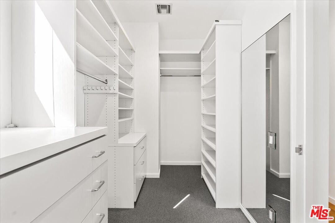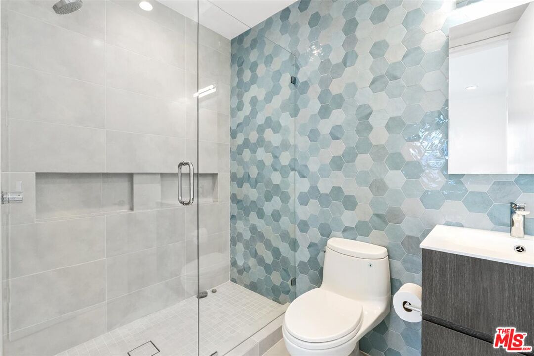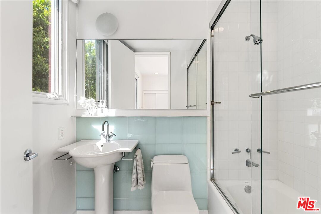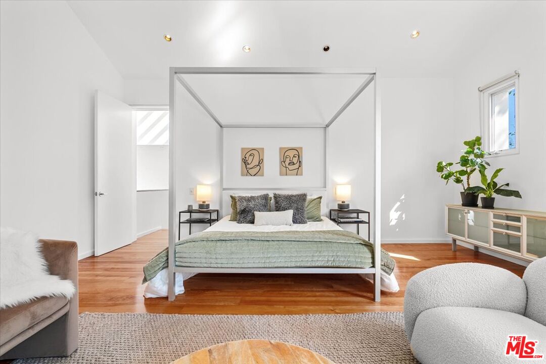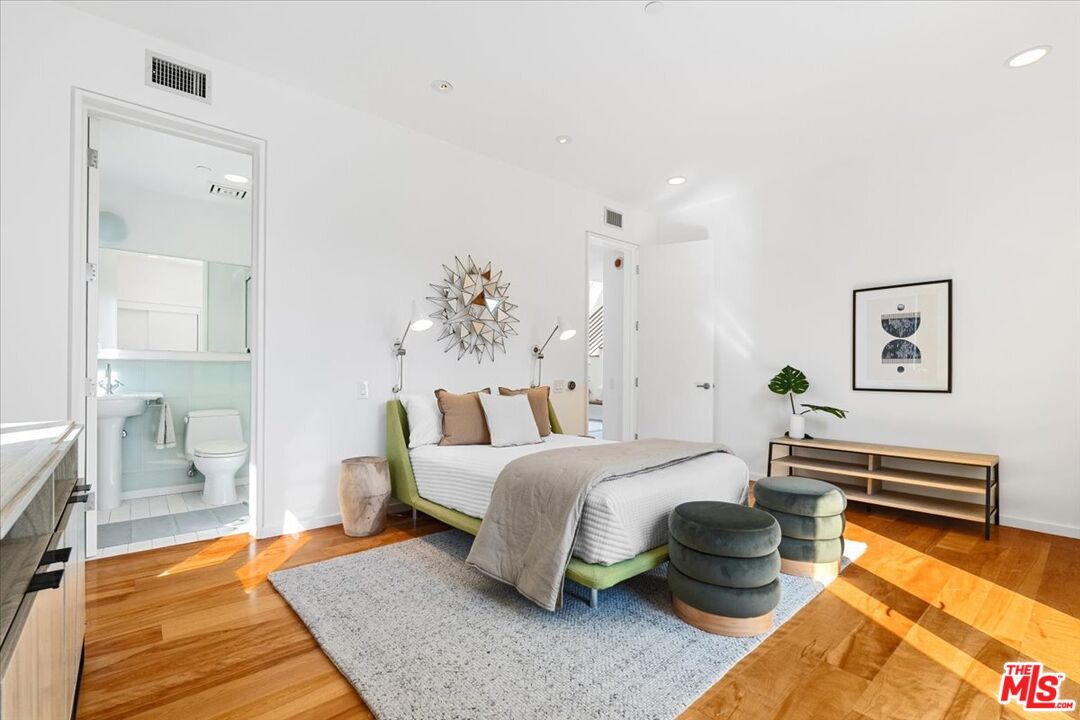 Tucked into one of the most sought-after streets in the Toluca Lake/Burbank pocket, this architectural home sits within a tightly held enclave of just 23 residences, a location that rarely comes available and is well known locally for its privacy and feel. The home pairs clean, modern design with warmth and livability, using materials like glazed concrete, birch, and cherry wood to create a refined, grounded aesthetic throughout. A two-story atrium and expansive skylights bring in natural light, enhancing the open main level that connects the living, dining, and kitchen spaces. The kitchen features Bulthaup cabinetry, Miele and Sub-Zero appliances, granite countertops, and custom wood finishes. Large sliding doors open to a private backyard designed for both everyday use and entertaining, with a pool, spa, firepit, and mature palms creating a true indoor-outdoor flow. The first floor also includes a powder room, a guest suite with its own patio, and a flexible bonus space ideal for a media room, gym, or office. Upstairs, the primary suite offers high ceilings, dual walk-in closets, and a well-appointed bath. A separate office suite with its own workspace and balcony adds flexibility, along with three additional bedrooms and a tucked-away reading nook. Located near the studios and the shops and restaurants in the Village of Toluca Lake along Riverside Drive, with easy access to the 134, 101, and 5, this home offers a rare combination of privacy, design, and convenience.